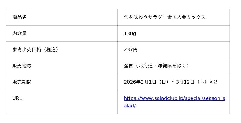 株式会社サラダクラブ(代表取締役社長:新谷昭人、本社:東京都調布市)は、2026年2月1日(日)~3月12日(木)までの期間限定で、「旬を味わうサラダ ミックス」(130g/税込237円)を発売します。また、発売を記念して、サラダクラブ公式Instagramでのプレゼントキャンペーンを実施します。
