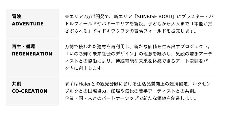 私たちは、単なるテーマパークではなく、《冒険|Adventure》《再生・循環|Regeneration》《共創|Co-Creation》の価値を体験できる場所として、社会とつながり次世代に誇れるテーマパーク施設を目指してまいります。」