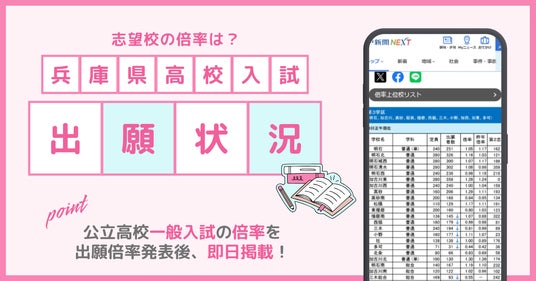 神戸新聞の電子版「神戸新聞NEXT」では、兵庫県の公立高校一般入試の出願状況を、2月25日(水)夕方頃より速報します。出願開始から志願変更、最終確定まで、複数回にわたって速報するため、志望校の状況確認や出願変更を考える際の判断材料として活用できます。