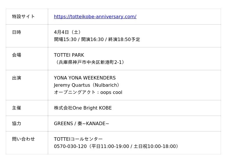 株式会社One Bright KOBE(住所:神戸市中央区、代表取締役社長 渋谷 順)では、TOTTEIの開港1周年を記念して行われる『TOTTEI KOBE 開港祭 -1st ANNIVERSARY-』のイベントの一つとして、『TOTTEI PARK FESTIVAL 2026』4月4日(土)DAY1の開催が決定したのでお知らせします。