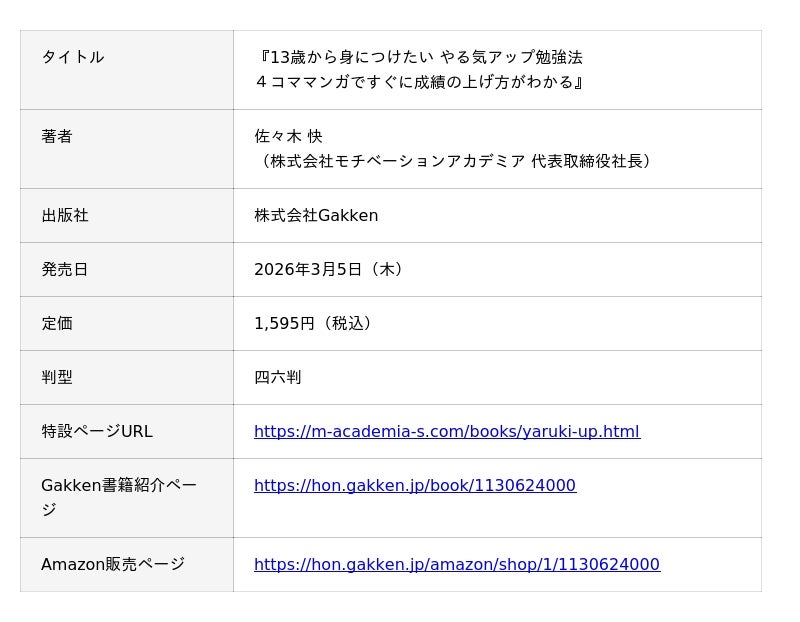 中高生向け個別指導塾「モチベーションアカデミア」(https://m-academia-s.com/)を運営する株式会社リンクアンドモチベーション(本社:東京都中央区、代表:小笹芳央、証券コード:2170)のグループ会社である株式会社モチベーションアカデミア(本社:東京都中央区、代表:佐々木快)は、中高生向けの自学自習メソッド「モチアカ式」を体系化した新刊『13歳から身につけたい やる気アップ勉強法』を、2026年3月5日(木)に株式会社Gakkenより出版いたします。
