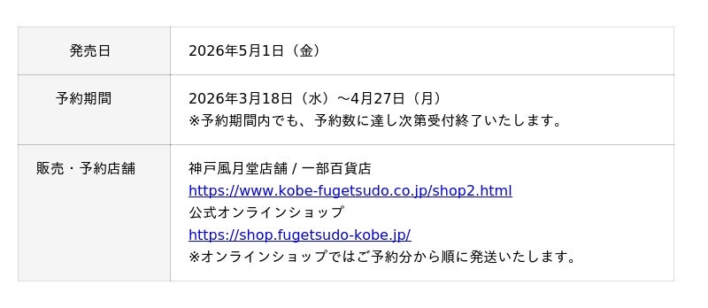 神戸風月堂店舗および百貨店(一部店舗を除く)、公式オンラインショップにて承ります。
