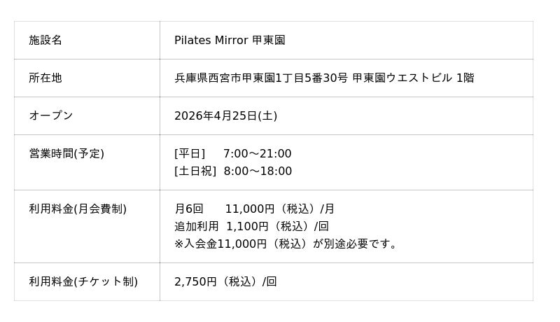 コナミスポーツ株式会社(以下、「弊社」)は、天井にミラーを設置したマシンピラティススタジオ「Pilates Mirror 甲東園(兵庫県西宮市)」を2026年4月25日(土)にオープンします。