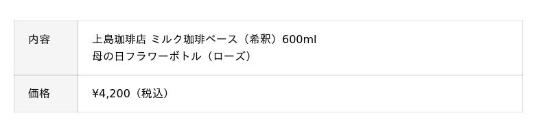 上島珈琲店の看板メニューである『ミルク珈琲』の味わいを、ご自宅で手軽に再現できるコーヒーベースと、ガラス瓶入りの華やかなフラワーボトルのセット。フラワーボトルには「thank you」のメッセージタグが付いているため、感謝を伝えるプレゼントにぴったりです。ギフトボックスを彩る「母の日デザインシール」をご選択いただけます。