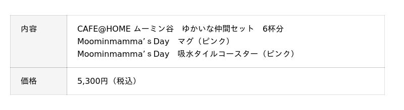 また、COFFEE STYLE UCC株式会社が販売する、UCC独自技術「フレッシュキューブ※2」で1杯分ずつ真空パックしたワンドリップコーヒー『CAFE@HOME(カフェアットホーム)』のバラエティ豊かなコーヒーと、上品なローズカラーが目を惹く限定マグカップ&コースターを組み合わせた、母の日限定のムーミンギフトセットも数量限定で登場します。ムーミン谷の仲間たちとともに、香り高いコーヒーをお楽しみいただけます。
