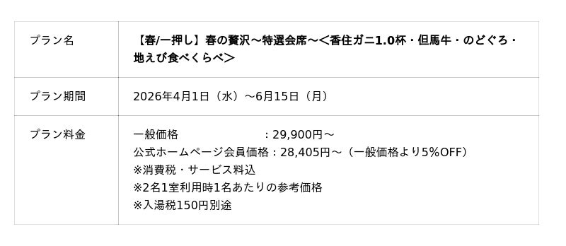 アイアンドエフ・ビルディング株式会社(本社:大阪市北区、代表取締役:泉 邦治)が運営するビナリオホテルズ&リゾーツの施設の1つ「山陰湯村温泉 湧泉(ゆうせん)の宿ゆあむ」(兵庫県)では春の味覚<香住ガニ1.0杯・但馬牛・のどぐろ・地えび食べくらべ>を堪能できる春の贅沢/特選グルメプランを2026年4月1日(水)~6月15日(月)にご提供いたします。