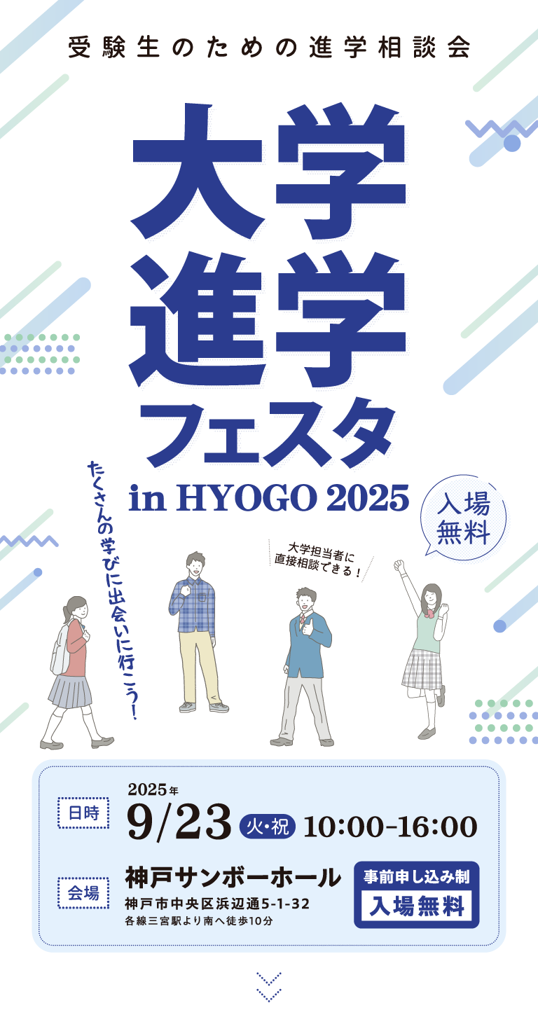 | お問合せ | 大学進学フェスタ in HYOGO 事務局 (神戸新聞社メディアビジネス局内) TEL078-362-7077(平日 10~17時) |