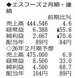 エスフーズ、売上高が過去最高更新 首都圏などで国産牛肉好調 25年2月期連結 2025/4/14 19:56 印刷 経済 (注)表の数字の単位は百万円。▲は赤字計上か、割合減少。前期の配当は実績 記事へ戻る 関連記事 尼崎のJR神戸線、線路に人が立ち入り電車と接触 大阪-姫路間など運転見合わせ 車2台と自転車1台を盗んだ疑いで男逮捕 衣料品など万引し、盗難車の使用発覚 西宮 フィギュア近畿選手権 三宅が初優勝 三原は2位 <ニュースなぜなに>高校野球、進む暑さ対策 試合2部制で熱中症予防 2台の軽乗用車が衝突 5人負傷、男子大学生が意識不明の重体 伊丹の県道 関連記事 尼崎のJR神戸線、線路に人が立ち入り電車と接触 大阪-姫路間など運転見合わせ 車2台と自転車1台を盗んだ疑いで男逮捕 衣料品など万引し、盗難車の使用発覚 西宮 フィギュア近畿選手権 三宅が初優勝 三原は2位 <ニュースなぜなに>高校野球、進む暑さ対策 試合2部制で熱中症予防 2台の軽乗用車が衝突 5人負傷、男子大学生が意識不明の重体 伊丹の県道 きょうの注目記事 バウムクーヘンが伝える戦争 ユーハイム氏の意志継ぐ体験施設とは 10/19 18:30 エース塩沢、8四死球と乱調 市尼崎が敗退 秋季近畿高校野球 10/19 20:50 高砂・生石神社の神事「竹割り」で男性3人転落 2人搬送 10/19 15:28 事件・事故 ヴィクトリーナ姫路が開幕4連勝 宮部がアタックで14得点の活躍 10/19 18:20 スポーツ ヴィクトリーナ 連覇狙う滝川第二が16強入り 神戸弘陵、AIE国際も 全国高校サッカー兵庫県予選 10/19 18:30 スポーツ 高校スポーツ サッカー ソフトクリームもサブスクに 4回目以降は食べるほどお得に 舞鶴若狭・西紀SA 10/19 05:30 丹波 グルメ 県都市対抗大会4強出そろう 住友電工伊丹 vs 川西野球クラブ 日亜鋼業 vs JBCワープ 10/19 20:35 スポーツ 野球 川西野球クラブが初の4強入り 松田、温水が一発攻勢 県都市対抗野球 10/19 20:40 スポーツ 野球 タコ餌木、海底にたまった1万3494個を回収 明石市漁連 10/19 05:30 明石 たつの市長選 現職と新人、2人の争い確定 26日投開票 10/19 17:05 社会 選挙 西播 西脇市ダブル選 市長選は2人の争い確定 26日投開票 10/19 17:06 社会 選挙 北播 産近甲龍の合格最多は<大学合格者ランキング 県内私学など> 10/19 05:57 大学合格者ランキング 産近甲龍・兵庫県内私学 県西宮高校 西宮東高校 きょうの注目記事 バウムクーヘンが伝える戦争 ユーハイム氏の意志継ぐ体験施設とは 10/19 18:30 エース塩沢、8四死球と乱調 市尼崎が敗退 秋季近畿高校野球 10/19 20:50 高砂・生石神社の神事「竹割り」で男性3人転落 2人搬送 10/19 15:28 事件・事故 ヴィクトリーナ姫路が開幕4連勝 宮部がアタックで14得点の活躍 10/19 18:20 スポーツ ヴィクトリーナ 連覇狙う滝川第二が16強入り 神戸弘陵、AIE国際も 全国高校サッカー兵庫県予選 10/19 18:30 スポーツ 高校スポーツ サッカー ソフトクリームもサブスクに 4回目以降は食べるほどお得に 舞鶴若狭・西紀SA 10/19 05:30 丹波 グルメ 県都市対抗大会4強出そろう 住友電工伊丹 vs 川西野球クラブ 日亜鋼業 vs JBCワープ 10/19 20:35 スポーツ 野球 川西野球クラブが初の4強入り 松田、温水が一発攻勢 県都市対抗野球 10/19 20:40 スポーツ 野球 タコ餌木、海底にたまった1万3494個を回収 明石市漁連 10/19 05:30 明石 たつの市長選 現職と新人、2人の争い確定 26日投開票 10/19 17:05 社会 選挙 西播 西脇市ダブル選 市長選は2人の争い確定 26日投開票 10/19 17:06 社会 選挙 北播 産近甲龍の合格最多は<大学合格者ランキング 県内私学など> 10/19 05:57 大学合格者ランキング 産近甲龍・兵庫県内私学 県西宮高校 西宮東高校 経済ニュース新着ニュース 経済ニュース新着ニュース