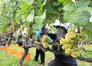 清酒大手の白鶴酒造(神戸市東灘区)は20日、「神戸ワイン」の原料となるブドウの収穫作業を、神戸市西区の農園で公開した。約40年前から神戸農政公社(同市西区)が製造・販売してきた同ワイン事業を昨年引き継ぎ、今回が初の収穫となる。2025年産の新酒として、10月に発売する。