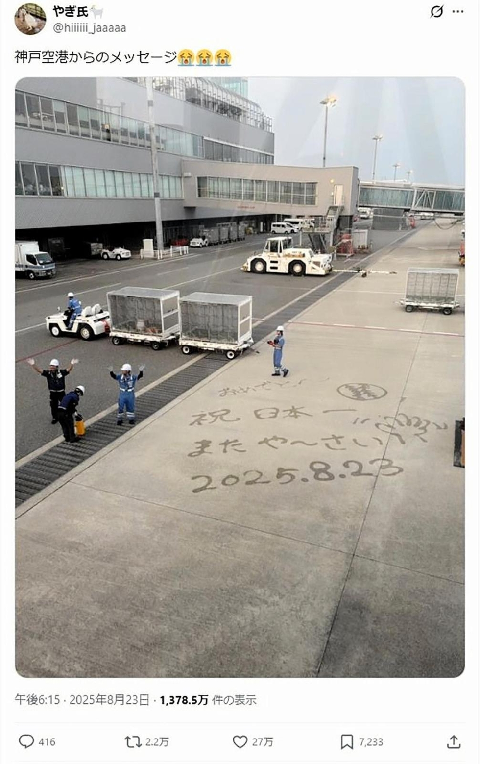 「祝日本一」甲子園Vの沖縄尚学を「水アート」で祝福 SNSで今夏話題に 神戸空港でスカイマークが作成 2025/12/21 17:30 印刷 経済 神戸空港 沖縄尚学の甲子園優勝を祝う水アートを紹介する「やぎ氏」さんの投稿。1千万回以上表示された 記事へ戻る 関連記事 神戸空港、開港20周年で記念ロゴ制作 6案提示、投票で採用へ 31日まで受け付け 神戸-関空ベイシャトル 低気圧の影響で30便欠航 高速船「神戸-関空ベイ・シャトル」、14日午前の計12便が欠航 強風や高波予想で すてきな神戸空港観光 神戸-南京線に続き、神戸-上海線も運休 吉祥航空が15日から 神戸と中国結ぶ航空便ゼロに 関連記事 神戸空港、開港20周年で記念ロゴ制作 6案提示、投票で採用へ 31日まで受け付け 神戸-関空ベイシャトル 低気圧の影響で30便欠航 高速船「神戸-関空ベイ・シャトル」、14日午前の計12便が欠航 強風や高波予想で すてきな神戸空港観光 神戸-南京線に続き、神戸-上海線も運休 吉祥航空が15日から 神戸と中国結ぶ航空便ゼロに きょうの注目記事 男子・西脇工、6位入賞 新妻昂主将「悔しい」 全国高校駅伝 12/21 19:39 スポーツ 駅伝 高校スポーツ 西脇工業高校 女子・須磨学園、耐えて8位入賞 主将の金子「8位と9位では全然違う」 12/21 19:05 スポーツ 駅伝 高校スポーツ 須磨学園高校 男子・須磨学園 全国の壁分厚く 前年よりタイム短縮も20位 12/21 19:49 スポーツ 駅伝 高校スポーツ 須磨学園高校 アイスダンス、紀平・西山は総合4位 「結成2カ月半で多くを吸収」 12/21 18:50 スポーツ フィギュア サッカー高円宮杯U-18、ヴィッセル神戸は初優勝ならず 12/21 17:11 スポーツ サッカー 高校スポーツ 姫路の養鶏場、ニワトリ24万羽の殺処分完了 鳥インフル確認で 12/21 11:25 社会 アサリ養殖、播磨灘で本格化 白浜では建設業者も参入 12/21 05:30 姫路 グルメ 甲子園Vの沖縄尚学を「水アート」で祝福 SNSで今夏話題に 12/21 17:30 経済 神戸空港 全国高校駅伝男子 西脇工6位、須磨学園20位 学法石川が大会新V 12/21 14:40 スポーツ 高校スポーツ 駅伝 全国高校駅伝女子 須磨学園8位 優勝は長野東 12/21 11:42 スポーツ 駅伝 高校スポーツ りくりゅうがフリーを欠場 三浦の左肩負傷で フィギュア全日本 12/21 13:40 スポーツ フィギュア 「はばタンPay+」は不公平? 利用率に地域差、もっとも使う地域は… 12/20 17:35 社会 地方行政 地域商品券・物価高対策 きょうの注目記事 男子・西脇工、6位入賞 新妻昂主将「悔しい」 全国高校駅伝 12/21 19:39 スポーツ 駅伝 高校スポーツ 西脇工業高校 女子・須磨学園、耐えて8位入賞 主将の金子「8位と9位では全然違う」 12/21 19:05 スポーツ 駅伝 高校スポーツ 須磨学園高校 男子・須磨学園 全国の壁分厚く 前年よりタイム短縮も20位 12/21 19:49 スポーツ 駅伝 高校スポーツ 須磨学園高校 アイスダンス、紀平・西山は総合4位 「結成2カ月半で多くを吸収」 12/21 18:50 スポーツ フィギュア サッカー高円宮杯U-18、ヴィッセル神戸は初優勝ならず 12/21 17:11 スポーツ サッカー 高校スポーツ 姫路の養鶏場、ニワトリ24万羽の殺処分完了 鳥インフル確認で 12/21 11:25 社会 アサリ養殖、播磨灘で本格化 白浜では建設業者も参入 12/21 05:30 姫路 グルメ 甲子園Vの沖縄尚学を「水アート」で祝福 SNSで今夏話題に 12/21 17:30 経済 神戸空港 全国高校駅伝男子 西脇工6位、須磨学園20位 学法石川が大会新V 12/21 14:40 スポーツ 高校スポーツ 駅伝 全国高校駅伝女子 須磨学園8位 優勝は長野東 12/21 11:42 スポーツ 駅伝 高校スポーツ りくりゅうがフリーを欠場 三浦の左肩負傷で フィギュア全日本 12/21 13:40 スポーツ フィギュア 「はばタンPay+」は不公平? 利用率に地域差、もっとも使う地域は… 12/20 17:35 社会 地方行政 地域商品券・物価高対策 経済ニュース新着ニュース 経済ニュース新着ニュース