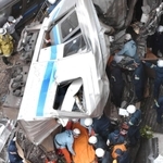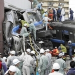 事故車両から乗客を救出するレスキュー隊員ら=2005年4月25日午前11時50分、尼崎市久々知3