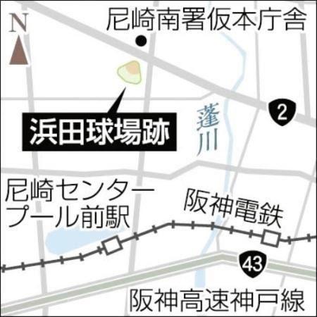 • 1990年に撮影された浜田球場。上部の球場北側を国道2号が東西に走る(尼崎市立地域研究史料館提供)