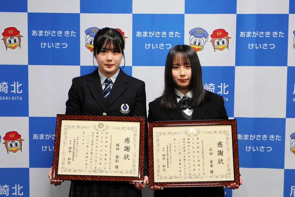 午後8時半、公園で座り込む男児「門限過ぎ、怒られるから帰れない…」 送り届けた女子高生2人に感謝状 尼崎 2025/12/22 05:30 印刷 阪神 署長感謝状を受けた植田葵彩さん(左)と石田茉希さん=尼崎北署 記事へ戻る 関連記事 特殊詐欺防止啓発の音声録音に協力 県立伊丹高放送部に感謝状 伊丹署 防犯担当課長、高齢夫婦の詐欺被害を阻止 福崎署、市川町職員に感謝状 奈良・御所市に3億円寄付 米寿男性「教育や福祉に」 老夫婦の車が転落→出火、発見した市職員の勇気ある行動 火勢増す中、髪の襟足焦げても救出 三田 おつかい収録のテレビ番組? 不安に思い幼児2人に声かけ保護 JA職員に感謝状 福崎 関連記事 特殊詐欺防止啓発の音声録音に協力 県立伊丹高放送部に感謝状 伊丹署 防犯担当課長、高齢夫婦の詐欺被害を阻止 福崎署、市川町職員に感謝状 奈良・御所市に3億円寄付 米寿男性「教育や福祉に」 老夫婦の車が転落→出火、発見した市職員の勇気ある行動 火勢増す中、髪の襟足焦げても救出 三田 おつかい収録のテレビ番組? 不安に思い幼児2人に声かけ保護 JA職員に感謝状 福崎 きょうの注目記事 兵庫県警外事課の捜査員ら10人超を処分へ 県警の懲戒、過去最多に 12/22 05:30 社会 【詳報】兵庫県警の懲戒処分、過去最多40人超に 12/22 05:30 社会 フィギュア坂本、全日本5連覇 日本女子初の3大会連続五輪決定 12/21 23:29 スポーツ フィギュア KAORI 有終の瞬間 五輪 圧巻の坂本 スピード、表現力追随許さず 会場総立ち、号泣 12/22 05:30 スポーツ フィギュア KAORI 有終の瞬間 大相続時代、広がる負担の裾野 地価高騰や少子化で税収3兆円超 12/22 06:00 日経電子版セレクト Inside Out 男子・西脇工 1年生アンカー岸本、最後まで力走 全国高校駅伝 12/22 05:30 スポーツ 駅伝 高校スポーツ 西脇工業高校 女子・須磨学園 エース池野絵「全力出し切れた」1区で力走4位 12/22 05:30 震災で犠牲、神戸大生・加藤貴光さん 暮らした西宮で追悼音楽会 12/22 05:30 神戸 震災31年 阪神 午後8時半、公園で座り込む男児 送り届けた女子高生2人に感謝状 12/22 05:30 <これぞ神戸流>看護師として働くシンガー・ソングライター・Pecoさん 12/22 05:30 神戸 連載神戸 障害ある人らに行われた強制不妊や中絶 補償・検証が本格化 12/22 05:30 社会 医療 男子・西脇工、6位入賞 新妻昂主将「悔しい」 序盤でリード奪えず 12/21 19:39 スポーツ 駅伝 高校スポーツ 西脇工業高校 きょうの注目記事 兵庫県警外事課の捜査員ら10人超を処分へ 県警の懲戒、過去最多に 12/22 05:30 社会 【詳報】兵庫県警の懲戒処分、過去最多40人超に 12/22 05:30 社会 フィギュア坂本、全日本5連覇 日本女子初の3大会連続五輪決定 12/21 23:29 スポーツ フィギュア KAORI 有終の瞬間 五輪 圧巻の坂本 スピード、表現力追随許さず 会場総立ち、号泣 12/22 05:30 スポーツ フィギュア KAORI 有終の瞬間 大相続時代、広がる負担の裾野 地価高騰や少子化で税収3兆円超 12/22 06:00 日経電子版セレクト Inside Out 男子・西脇工 1年生アンカー岸本、最後まで力走 全国高校駅伝 12/22 05:30 スポーツ 駅伝 高校スポーツ 西脇工業高校 女子・須磨学園 エース池野絵「全力出し切れた」1区で力走4位 12/22 05:30 震災で犠牲、神戸大生・加藤貴光さん 暮らした西宮で追悼音楽会 12/22 05:30 神戸 震災31年 阪神 午後8時半、公園で座り込む男児 送り届けた女子高生2人に感謝状 12/22 05:30 <これぞ神戸流>看護師として働くシンガー・ソングライター・Pecoさん 12/22 05:30 神戸 連載神戸 障害ある人らに行われた強制不妊や中絶 補償・検証が本格化 12/22 05:30 社会 医療 男子・西脇工、6位入賞 新妻昂主将「悔しい」 序盤でリード奪えず 12/21 19:39 スポーツ 駅伝 高校スポーツ 西脇工業高校 阪神新着ニュース 阪神新着ニュース