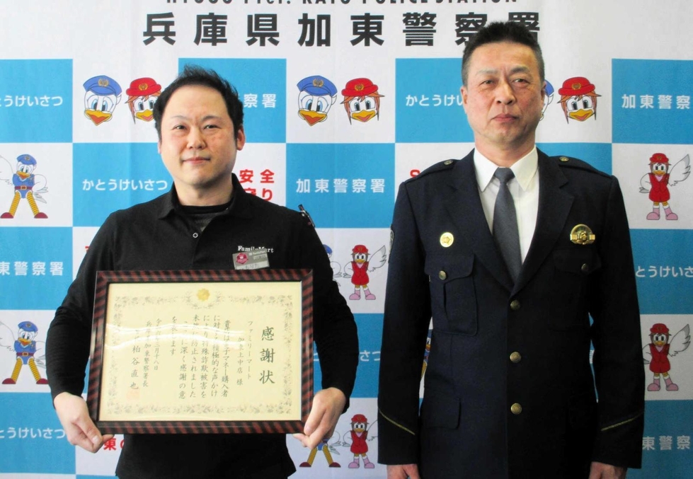 電子マネーカード購入客への声掛け徹底 加東のコンビニ店、80代女性の特殊詐欺被害防ぐ 2024/3/27 05:30 印刷 北播 感謝状を受け取った森田圭輔店長(左)と、柏谷直也署長=加東署(同署提供) 記事へ戻る 関連記事 「3億4500万円の入金完了」とメール 不審に感じた金融機関職員、交番へ 兵庫・三木 「高額なので時間が…」と足止め、トイレにも見張り 職員一丸で逮捕に協力したJA兵庫みらい加西支店 知人が説得しても気づかない、特殊詐欺の巧妙な罠 電子マネーカード30万円分、買いに来たのは幼なじみ客 「イラクで戦争に巻き込まれた看護師を助けないと」 郵便局員が機転「ちょっと落ち着きましょうか」 兵庫・三木 「オレオレ詐欺」見抜いた私は大丈夫、と思っていたのに…警戒心を簡単にかいくぐる手口 被害女性が語る 関連記事 「3億4500万円の入金完了」とメール 不審に感じた金融機関職員、交番へ 兵庫・三木 「高額なので時間が…」と足止め、トイレにも見張り 職員一丸で逮捕に協力したJA兵庫みらい加西支店 知人が説得しても気づかない、特殊詐欺の巧妙な罠 電子マネーカード30万円分、買いに来たのは幼なじみ客 「イラクで戦争に巻き込まれた看護師を助けないと」 郵便局員が機転「ちょっと落ち着きましょうか」 兵庫・三木 「オレオレ詐欺」見抜いた私は大丈夫、と思っていたのに…警戒心を簡単にかいくぐる手口 被害女性が語る きょうの注目記事 「自民らしい政策」「政治とカネ問題に向き合って」 新首相に県内国会議員から期待や注文の声 10/22 05:30 「自衛隊に子どもの個人情報提供」は本当? 提供しているが18歳と21歳 神戸市長選ファクト検証 10/22 05:30 神戸市の起業家支援10年、なお途上 新規上場はメタバース関連1社のみ 若手の人材育成に着手 10/22 05:30 「子育てしやすい国に」「食品の消費税0%に」高市氏の手腕、有権者ら注目 維新との連立に懸念も 10/21 20:20 レタスやキャベツ、カーネーションなど県内被害 「タバコガ類」注意報 薬剤での早期防除呼びかけ 10/22 05:30 佐用町長選告示 三つどもえ論戦始まる 人口減対策、地域活性化など争点 10/22 05:30 新温泉町長選告示 合併後最多4人立候補、地域課題訴え 町議選に15人の争い 26日投開票 10/22 05:30 ヴィッセル・冨永「ゴール決め守備でも躍動する」 22日アウェーACLE1次リーグ江原戦 10/22 05:30 西脇市長選 立候補者2人の主張や横顔を紹介 26日に投開票 10/22 05:30 公立中の部活動、東播磨は加古川市・高砂市・稲美町が「完全移行」へ 明石市はまず休日から 10/21 18:05 県庁舎建て替え、経費含め810億円の見込み 斎藤知事が初公表 有識者ら上振れリスク指摘 10/21 19:00 神戸市長選 久元氏がリード、五島氏続く 4割は態度未定 神戸新聞情勢調査 10/21 05:30 きょうの注目記事 「自民らしい政策」「政治とカネ問題に向き合って」 新首相に県内国会議員から期待や注文の声 10/22 05:30 「自衛隊に子どもの個人情報提供」は本当? 提供しているが18歳と21歳 神戸市長選ファクト検証 10/22 05:30 神戸市の起業家支援10年、なお途上 新規上場はメタバース関連1社のみ 若手の人材育成に着手 10/22 05:30 「子育てしやすい国に」「食品の消費税0%に」高市氏の手腕、有権者ら注目 維新との連立に懸念も 10/21 20:20 レタスやキャベツ、カーネーションなど県内被害 「タバコガ類」注意報 薬剤での早期防除呼びかけ 10/22 05:30 佐用町長選告示 三つどもえ論戦始まる 人口減対策、地域活性化など争点 10/22 05:30 新温泉町長選告示 合併後最多4人立候補、地域課題訴え 町議選に15人の争い 26日投開票 10/22 05:30 ヴィッセル・冨永「ゴール決め守備でも躍動する」 22日アウェーACLE1次リーグ江原戦 10/22 05:30 西脇市長選 立候補者2人の主張や横顔を紹介 26日に投開票 10/22 05:30 公立中の部活動、東播磨は加古川市・高砂市・稲美町が「完全移行」へ 明石市はまず休日から 10/21 18:05 県庁舎建て替え、経費含め810億円の見込み 斎藤知事が初公表 有識者ら上振れリスク指摘 10/21 19:00 神戸市長選 久元氏がリード、五島氏続く 4割は態度未定 神戸新聞情勢調査 10/21 05:30 北播新着ニュース 北播新着ニュース