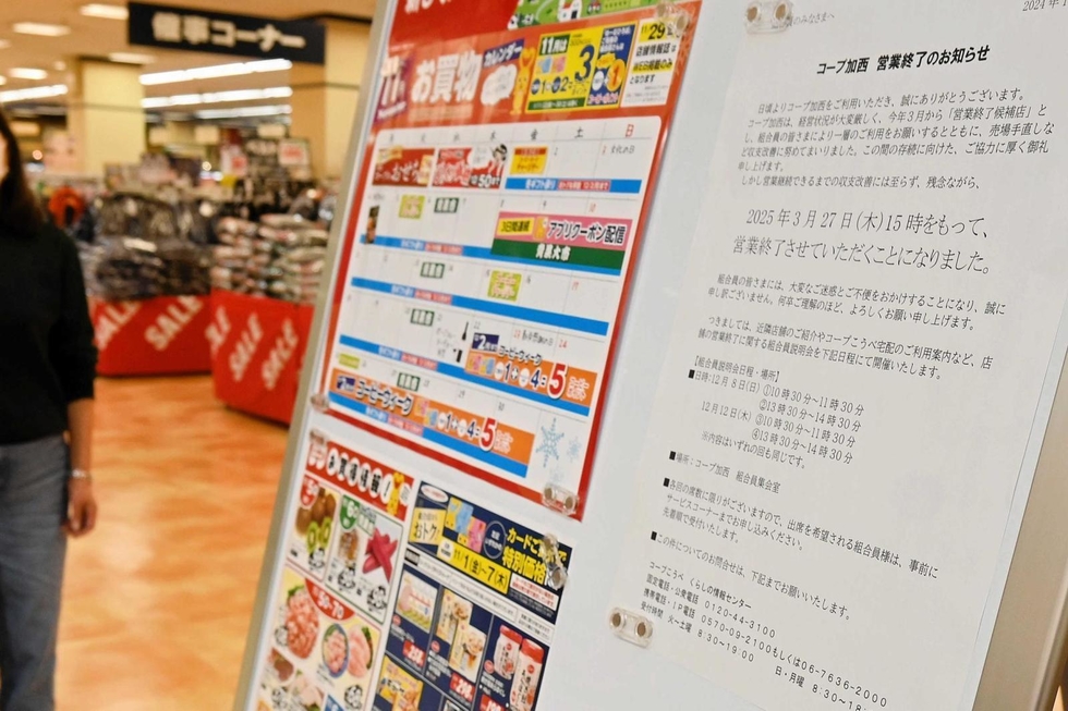 コープ加西、来年3月閉店 惜しむ買い物客「残念」 競争激化で苦戦 市「後継、可能な限り努力」 2024/11/8 05:30 印刷 北播 経済 コープこうべ 来年3月での営業終了を伝える張り紙=コープ加西 記事へ戻る 関連記事 三田市会一般質問、7人登壇 部活動地域移行や「フローラ88」閉店影響、市の見解問う ダイエー西宮店、25年2月に閉店 イオンがショッピングセンターに改装へ 三田市の大型商業施設「フローラ88」来年2月末に閉店 業績不振で 新たな商業施設建設へ 車両工場のぞいてみて 北条鉄道と神鉄、3月に見学会 小学生向け、参加募る 豊岡女子6位、1部維持 但馬勢躍進、朝来男子は16位 郡市区駅伝 関連記事 三田市会一般質問、7人登壇 部活動地域移行や「フローラ88」閉店影響、市の見解問う ダイエー西宮店、25年2月に閉店 イオンがショッピングセンターに改装へ 三田市の大型商業施設「フローラ88」来年2月末に閉店 業績不振で 新たな商業施設建設へ 車両工場のぞいてみて 北条鉄道と神鉄、3月に見学会 小学生向け、参加募る 豊岡女子6位、1部維持 但馬勢躍進、朝来男子は16位 郡市区駅伝 きょうの注目記事 神明社長「26年産米、暴落の可能性」増産で在庫膨らみ、輸入も拡大 10/11 05:30 経済 神明ホールディングス <ひょうごクロニクル>(13)1950~2025 博覧会の世紀 10/11 05:30 ひょうごクロニクル 万博 放置柿、おいしく生かそう ジャムや菓子などに加工 丹波市の住民グループ 10/11 05:30 丹波 連載丹波 東播地域、景況感改善やや鈍化 続くコスト上昇 景気「悪い」3ポイント増 但陽信金7~9月期業況調査 10/11 05:30 東播 経済 たつののコストコ出店計画、白紙に 龍野IC付近 区画整理は実施 10/11 05:30 西播 地方行政 明石市、いじめ防止基本方針策定へ 検討委が初会合 年度内の完成目指す 10/11 05:30 明石 教育 地方行政 豊臣家に仕え、尼崎を治めた戦国武将・建部氏の足跡 NHK大河「豊臣兄弟!」放送を前に特別展 10/11 05:30 阪神 文化 竹野の未来を魅力的に 豊岡・竹野学園の中学生、住民への取材成果発表 10/11 05:30 但馬 教育 心一つにハーモニー、津名中が2年ぶり金賞 関西吹奏楽コンクール・中学生小編成の部 10/11 05:30 淡路 ポートライナー三宮駅、西改札を29年度新設へ JR新駅ビルに接続、混雑緩和と乗り換え時間短縮狙う 神戸市 10/10 18:11 経済 神戸 10月11日から播磨で秋祭り集中日 松原八幡神社と大塩天満宮の周辺で交通規制 10/11 05:30 姫路 秋祭り 神戸市長選、12年ぶり単独選挙へ 現職と新人の4人が立候補表明 12日告示 10/11 05:30 社会 神戸市長選 神戸 きょうの注目記事 神明社長「26年産米、暴落の可能性」増産で在庫膨らみ、輸入も拡大 10/11 05:30 経済 神明ホールディングス <ひょうごクロニクル>(13)1950~2025 博覧会の世紀 10/11 05:30 ひょうごクロニクル 万博 放置柿、おいしく生かそう ジャムや菓子などに加工 丹波市の住民グループ 10/11 05:30 丹波 連載丹波 東播地域、景況感改善やや鈍化 続くコスト上昇 景気「悪い」3ポイント増 但陽信金7~9月期業況調査 10/11 05:30 東播 経済 たつののコストコ出店計画、白紙に 龍野IC付近 区画整理は実施 10/11 05:30 西播 地方行政 明石市、いじめ防止基本方針策定へ 検討委が初会合 年度内の完成目指す 10/11 05:30 明石 教育 地方行政 豊臣家に仕え、尼崎を治めた戦国武将・建部氏の足跡 NHK大河「豊臣兄弟!」放送を前に特別展 10/11 05:30 阪神 文化 竹野の未来を魅力的に 豊岡・竹野学園の中学生、住民への取材成果発表 10/11 05:30 但馬 教育 心一つにハーモニー、津名中が2年ぶり金賞 関西吹奏楽コンクール・中学生小編成の部 10/11 05:30 淡路 ポートライナー三宮駅、西改札を29年度新設へ JR新駅ビルに接続、混雑緩和と乗り換え時間短縮狙う 神戸市 10/10 18:11 経済 神戸 10月11日から播磨で秋祭り集中日 松原八幡神社と大塩天満宮の周辺で交通規制 10/11 05:30 姫路 秋祭り 神戸市長選、12年ぶり単独選挙へ 現職と新人の4人が立候補表明 12日告示 10/11 05:30 社会 神戸市長選 神戸 北播新着ニュース 北播新着ニュース