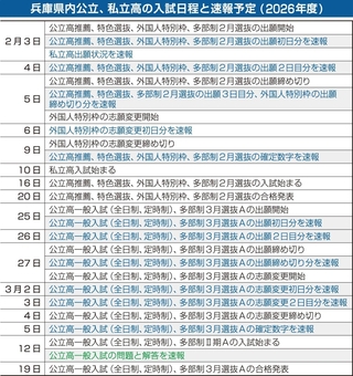 兵庫の高校受験、お役立ち情報満載 3日から出願状況を速報 過去問も掲載 2026/2/2 14:45 印刷 高校受験 教育 社会 インフォメーション 入試イメージ(yasuyasu99/stock.adobe.com) 記事へ戻る 関連記事 東京で中学受験本格化、演説自粛 「主張伝える機会だが…」 受験生「投票行きたいけれど…」 衆院選、入試ピークと丸かぶり 初選挙に戸惑いの声 兵庫県内の私立中学36校で入試始まる 4888人が受験、倍率1.26倍 大阪の私立中学、出願者数が5年連続増加 初日試験の平均倍率は2.40倍に 【出願状況一覧付き】兵庫の私立中学入試の出願状況発表 平均倍率3.18倍 関連記事 東京で中学受験本格化、演説自粛 「主張伝える機会だが…」 受験生「投票行きたいけれど…」 衆院選、入試ピークと丸かぶり 初選挙に戸惑いの声 兵庫県内の私立中学36校で入試始まる 4888人が受験、倍率1.26倍 大阪の私立中学、出願者数が5年連続増加 初日試験の平均倍率は2.40倍に 【出願状況一覧付き】兵庫の私立中学入試の出願状況発表 平均倍率3.18倍 きょうの注目記事 衆院選の期日前投票、5日間で3.4% 前回をやや上回る 最高は市川町の15.33% 2/2 16:02 社会 衆院選26 高校生が動画で地域の魅力PRする「観光甲子園」 愛知の刈谷北高がグランプリ 神戸で決勝戦 2/2 16:11 社会 神戸 教育 衆院選 三木市選管、期日前投票で用紙を二重交付 「投票済ませた」システムの表示見落とす 2/2 16:11 社会 三木 衆院選26 市川町の期日前投票所、比例と国民審査で投票用紙を二重交付 交付列に2回並んだ可能性 2/2 16:20 社会 衆院選26 西播 鋳物製品の加工、ロボットの遠隔操作が可能に 川崎重工業が高知の工場にシステム納入 2/2 17:15 経済 川崎重工業 世界席巻のオニツカタイガー、快走の要因は? 直営店拡大にかじ、パリ・シャンゼリゼ通りに旗艦店 2/2 05:30 経済 アシックス 目は見えずとも、心開き生徒を見つめる 神戸・葺合高校の英語教諭 2/1 23:00 視 神戸 葺合高校 教育 動画ニュース 衆院選・兵庫12選挙区、どの候補がリード? 終盤情勢の調査結果を速報 2/2 12:15 インフォメーション 衆院選26 <ひと探訪>高校生の日本舞踊家・芙蓉一叶律さん 2/2 05:30 阪神 連載阪神 兵庫の高校受験、お役立ち情報満載 3日から出願状況を速報 過去問も掲載 2/2 14:45 高校受験 教育 社会 インフォメーション 但馬地区里親会、制度の普及に努め32年 兵庫全域に出前講座拡大 2/2 05:30 但馬 <流転変転 2026ひょうご衆院選>(上)新たな政権枠組み 2/2 05:30 社会 衆院選26 きょうの注目記事 衆院選の期日前投票、5日間で3.4% 前回をやや上回る 最高は市川町の15.33% 2/2 16:02 社会 衆院選26 高校生が動画で地域の魅力PRする「観光甲子園」 愛知の刈谷北高がグランプリ 神戸で決勝戦 2/2 16:11 社会 神戸 教育 衆院選 三木市選管、期日前投票で用紙を二重交付 「投票済ませた」システムの表示見落とす 2/2 16:11 社会 三木 衆院選26 市川町の期日前投票所、比例と国民審査で投票用紙を二重交付 交付列に2回並んだ可能性 2/2 16:20 社会 衆院選26 西播 鋳物製品の加工、ロボットの遠隔操作が可能に 川崎重工業が高知の工場にシステム納入 2/2 17:15 経済 川崎重工業 世界席巻のオニツカタイガー、快走の要因は? 直営店拡大にかじ、パリ・シャンゼリゼ通りに旗艦店 2/2 05:30 経済 アシックス 目は見えずとも、心開き生徒を見つめる 神戸・葺合高校の英語教諭 2/1 23:00 視 神戸 葺合高校 教育 動画ニュース 衆院選・兵庫12選挙区、どの候補がリード? 終盤情勢の調査結果を速報 2/2 12:15 インフォメーション 衆院選26 <ひと探訪>高校生の日本舞踊家・芙蓉一叶律さん 2/2 05:30 阪神 連載阪神 兵庫の高校受験、お役立ち情報満載 3日から出願状況を速報 過去問も掲載 2/2 14:45 高校受験 教育 社会 インフォメーション 但馬地区里親会、制度の普及に努め32年 兵庫全域に出前講座拡大 2/2 05:30 但馬 <流転変転 2026ひょうご衆院選>(上)新たな政権枠組み 2/2 05:30 社会 衆院選26 インフォメーション新着ニュース インフォメーション新着ニュース