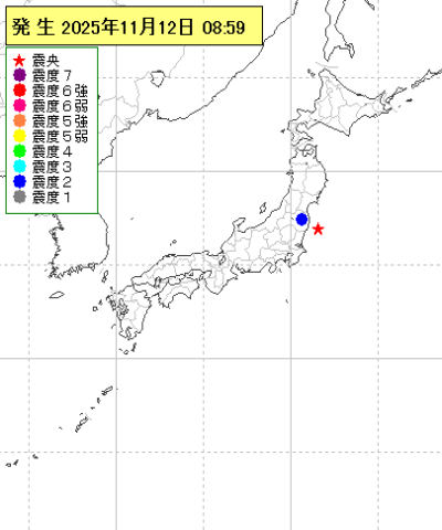 | 2025年11月12日08時59分ごろ | 福島県沖 | 3.3 | 2 |