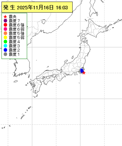 | 2025年11月16日16時03分ごろ | 千葉県東方沖 | 3.8 | 2 |