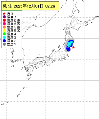 | 2025年12月01日02時26分ごろ | 宮城県沖 | 4.7 | 3 |