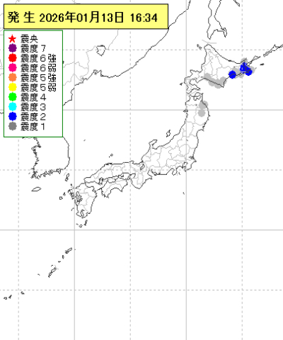 | 2026年01月13日16時34分ごろ | 択捉島南東沖 | 6.2 | 2 |