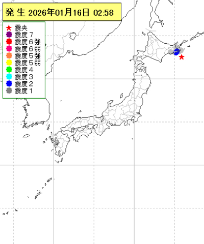 | 2026年01月16日02時58分ごろ | 釧路沖 | 3.9 | 2 |