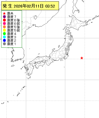 | 2026年02月11日03時52分ごろ | 関東東方沖 | 5.1 | 1 |