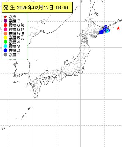 | 2026年02月12日03時00分ごろ | 北海道東方沖 | 5.2 | 3 |