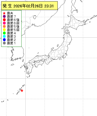 | 2026年02月26日23時31分ごろ | 沖縄本島近海 | 3.3 | 1 |