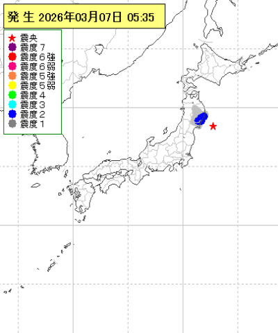 | 2026年03月07日05時31分ごろ | 宮城県沖 | 4.9 | 3 |