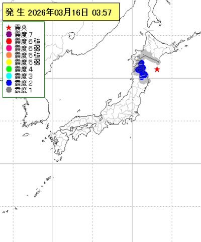 | 2026年03月16日03時57分ごろ | 青森県東方沖 | 4.9 | 2 |