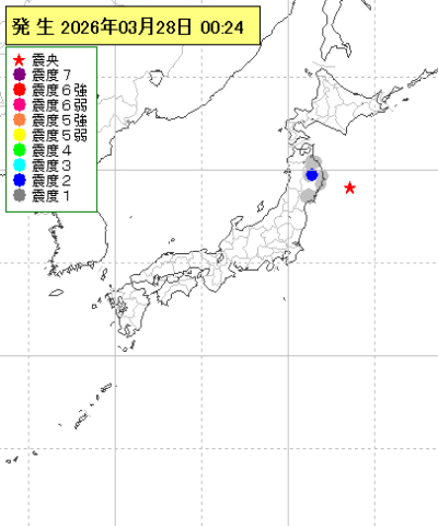 | 2026年03月28日00時24分ごろ | 三陸沖 | 4.7 | 2 |
