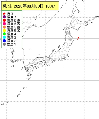 | 2026年03月30日16時47分ごろ | 岩手県沖 | 4.3 | 1 |