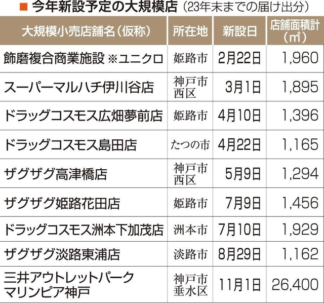 大規模小売店舗立地法(大店立地法)に基づき、兵庫県内で2024年中の新設を届け出た商業施設が、昨年末時点で9カ所あることが分かった。うち6施設をドラッグストアが占めており、県内各地で進出が目立っている。