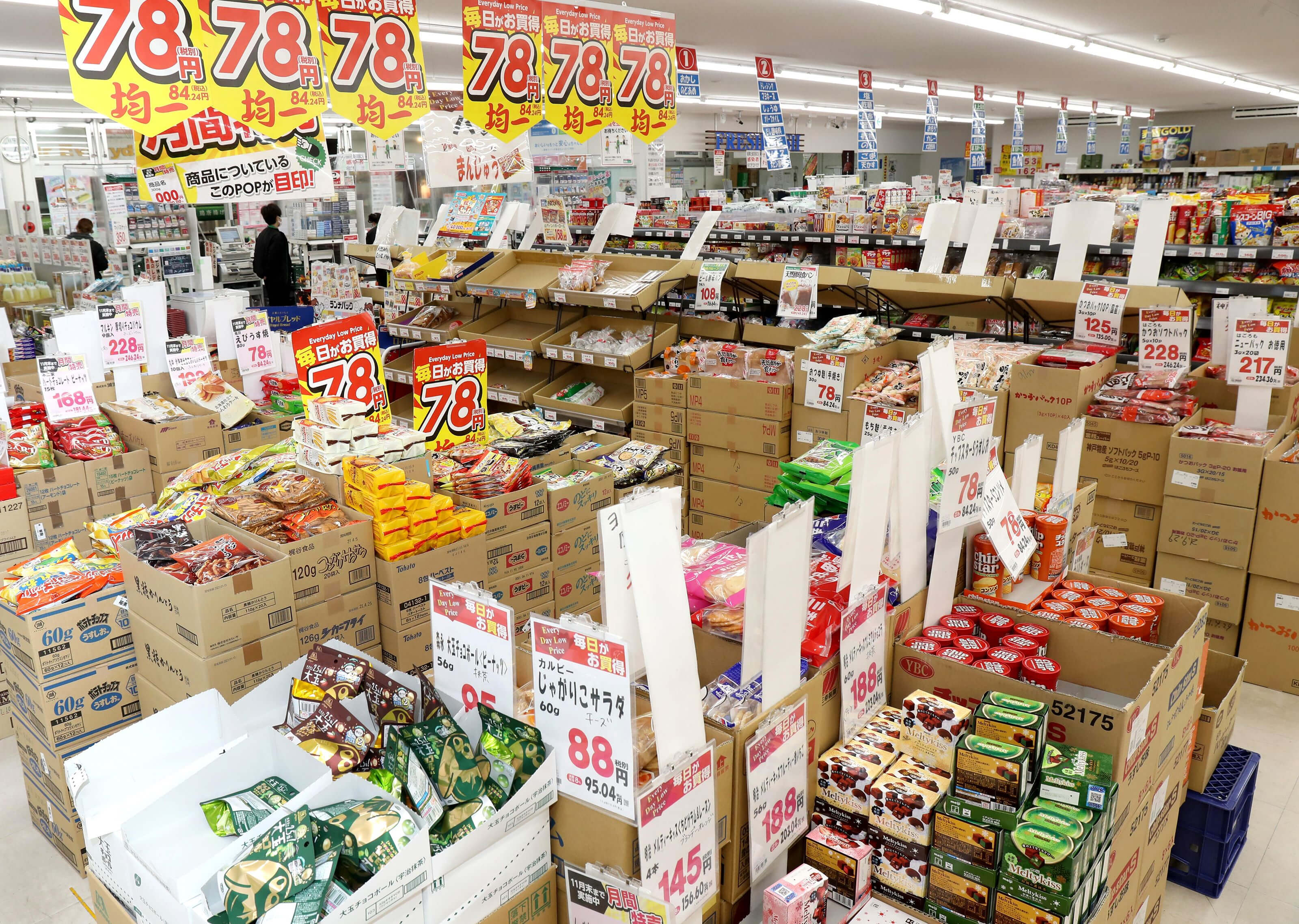 象徴する風景が「箱陳(はこちん)」だ。菓子や常温食品を段ボールに入ったまま陳列する。スーパーの常道では、賞味期限の早い商品を棚の手前に並べ、新しい物を後ろに納める。ただ、従業員にとっては回転の良 い商品であればあるほど時間を取られる。業務スーパーはそこを問題視し、売れ筋商品ほど段ボールで、となった。「大切なのは見栄えではない」と沼田社長。曜日ごとの特売日は基本的に設けず、広告費を抑えている。販管費を低くできればその分を価格に反映できる。