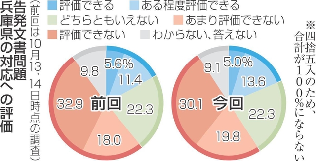 神戸新聞社とJX通信社が3、4日に実施した情勢調査では、今回の兵庫県知事選(17日投開票)のきっかけになった告発文書問題を巡る県の対応の是非も尋ねた。「あまり評価できない」を含め「評価できない」は計49・9%と、半数近くが厳しい見方を示した。「評価する」は「ある程度」を含めても、18・6%にとどまっている。一方で、前知事の斎藤元彦氏(47)の県政運営を支持すると回答した人の割合は先月の調査から8・6ポイント上昇した。