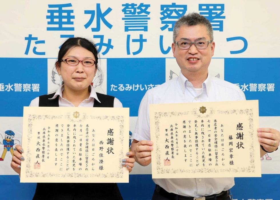暑かった7月、車内放置の1歳児に「危ない」 パチンコに興じた母は逮捕…悲劇防いだ従業員の機転 2023/8/4 05:30 印刷 神戸 感謝状を受け取った西野佳澄さん(左)と藤岡宏章さん=垂水署 記事へ戻る 関連記事 パチンコ店駐車場で1歳男児を車内に40分放置 母親と交際相手を逮捕 家族で昼寝はウソ 乳幼児4人放置し8時間パチンコ、生後3カ月の子が死亡 22歳の女子大生、ベビーカーごと女児略取未遂「目を離すと危険と分からせるため」 「娘がいない、靴が無い」保護者会の最中に夫から緊急連絡 亡くなった母の遺体を自宅に放置か 容疑で逮捕の52歳男「生きていると思っていた」 兵庫・西宮 関連記事 パチンコ店駐車場で1歳男児を車内に40分放置 母親と交際相手を逮捕 家族で昼寝はウソ 乳幼児4人放置し8時間パチンコ、生後3カ月の子が死亡 22歳の女子大生、ベビーカーごと女児略取未遂「目を離すと危険と分からせるため」 「娘がいない、靴が無い」保護者会の最中に夫から緊急連絡 亡くなった母の遺体を自宅に放置か 容疑で逮捕の52歳男「生きていると思っていた」 兵庫・西宮 きょうの注目記事 デンマーク家具「PPモブラー」が神戸に進出 日本法人と本社設立「街並みとイメージがマッチ」 10/20 18:45 経済 神戸 26年度の公立高募集定員、兵庫県教委が発表 全日制、前年度比160人減で過去最少に 10/20 17:04 「神戸経済はバランス良く好循環」地域経済循環率はおおむね100%で推移 課題は人口減 10/20 19:00 <公判ルポ 宝塚クロスボウ4人殺傷事件>(1)うつむく男 審理6回、被告の心の動きは 10/20 17:30 業績好調アシックス、目指すは「ガチンコ経営」 株式持ち合い完全解消へ個人投資家向け説明会を強化 10/20 18:00 自民、維新が連立政権樹立で正式合意 10/20 18:18 囲碁天元戦 一力連勝か、志田タイか 21日に第2局 10/20 17:09 文化 囲碁将棋 天元戦 国民・玉木代表「なぜ議員定数削減が最大の課題なのか」自維連立に苦言 神戸で演説 10/20 17:51 海や草花をモチーフに子どもら645人が絵筆握る 淡路島「夢舞台」で絵画コンクール 10/20 16:41 社会 淡路 神戸市長選、どの候補がリード? 情勢調査結果を速報 10/20 05:30 インフォメーション 神戸市長選 21日の交通取り締まり(2025年10月) 10/20 18:15 社会 交通取り締まり 万博後の兵庫経済どう活性化 人手不足の解消や産業用地の拡大を 県商工会議所連合会が県政に要望 10/20 18:30 経済 川崎博也氏 商工会議所 きょうの注目記事 デンマーク家具「PPモブラー」が神戸に進出 日本法人と本社設立「街並みとイメージがマッチ」 10/20 18:45 経済 神戸 26年度の公立高募集定員、兵庫県教委が発表 全日制、前年度比160人減で過去最少に 10/20 17:04 「神戸経済はバランス良く好循環」地域経済循環率はおおむね100%で推移 課題は人口減 10/20 19:00 <公判ルポ 宝塚クロスボウ4人殺傷事件>(1)うつむく男 審理6回、被告の心の動きは 10/20 17:30 業績好調アシックス、目指すは「ガチンコ経営」 株式持ち合い完全解消へ個人投資家向け説明会を強化 10/20 18:00 自民、維新が連立政権樹立で正式合意 10/20 18:18 囲碁天元戦 一力連勝か、志田タイか 21日に第2局 10/20 17:09 文化 囲碁将棋 天元戦 国民・玉木代表「なぜ議員定数削減が最大の課題なのか」自維連立に苦言 神戸で演説 10/20 17:51 海や草花をモチーフに子どもら645人が絵筆握る 淡路島「夢舞台」で絵画コンクール 10/20 16:41 社会 淡路 神戸市長選、どの候補がリード? 情勢調査結果を速報 10/20 05:30 インフォメーション 神戸市長選 21日の交通取り締まり(2025年10月) 10/20 18:15 社会 交通取り締まり 万博後の兵庫経済どう活性化 人手不足の解消や産業用地の拡大を 県商工会議所連合会が県政に要望 10/20 18:30 経済 川崎博也氏 商工会議所 神戸新着ニュース 神戸新着ニュース