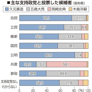 神戸市長選が投開票された26日、神戸新聞社は市内45カ所で出口調査を実施し、約1750人から回答を得た。4選を確実にした久元喜造氏(71)=自民県連、立民県連、国民県連、公明推薦=が、自民、公明の支持層を中心に手堅く票をまとめ、無党派層からも約6割を集めるなど幅広く浸透した。(四捨五入の関係で、比率の合計は必ずしも100%にならない)(田中宏樹、千葉翔大)