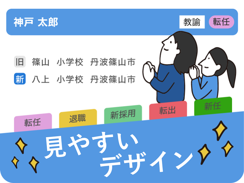 色分けされたアイコンで、新旧の学校名や役職、新任・転任・退職などをわかりやすく表示します。