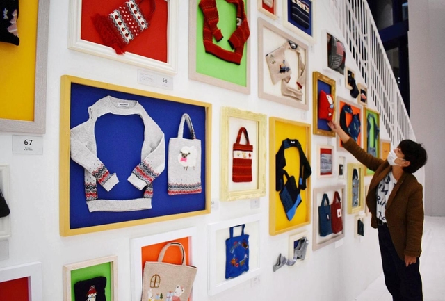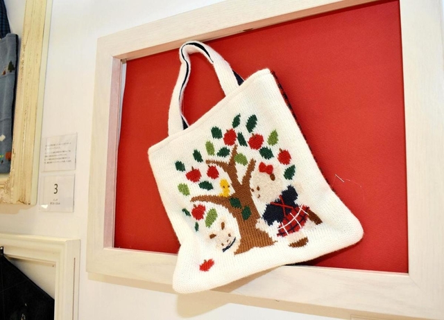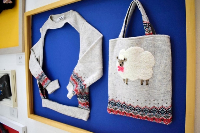 思い出深い子ども服を再利用してみたら-。ファミリア(神戸市中央区)は、ニットの子ども服を使って試作したバッグやポーチなど70点を、神戸・旧居留地の神戸本店内で展示している。