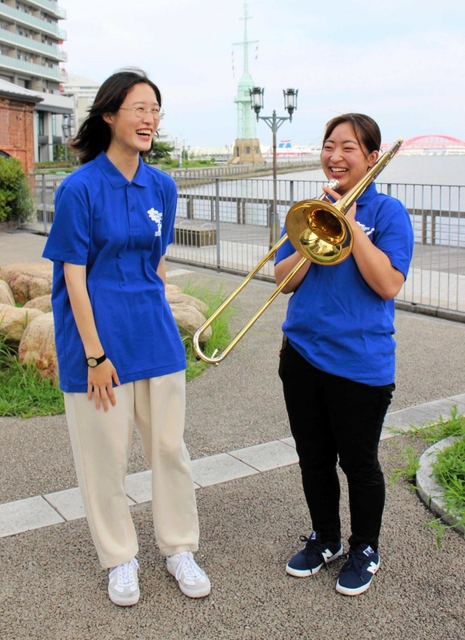 実行委員長でトロンボーンを手にする森安愛莉さん(右)と広報部局長の奥村奏さん=神戸ハーバーランド
