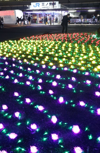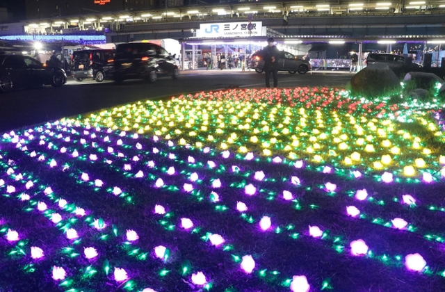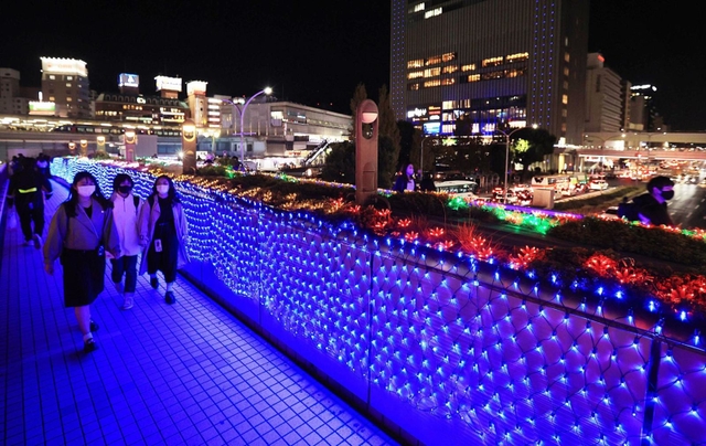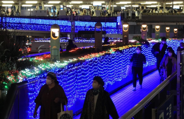 JR三ノ宮駅周辺の歩行者用デッキ4カ所でブルーライトを点灯。駅南側のロータリーでは、黄色や赤など色とりどりの電飾が敷き詰められ、通行人らが「きれい」「もう冬やね」と眺めていた。
