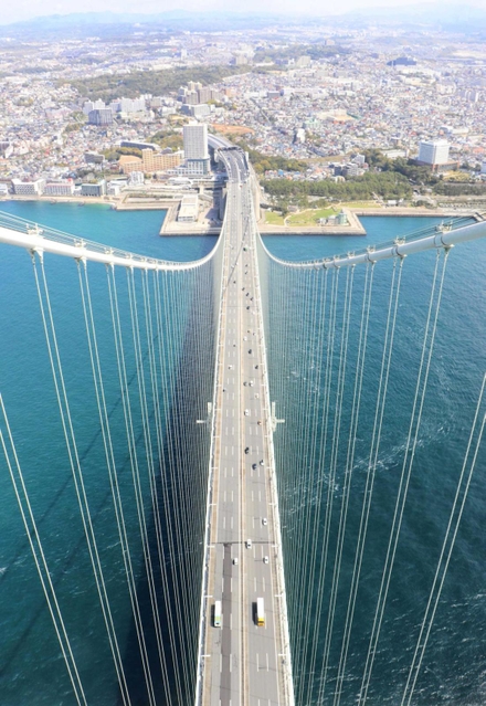 海面から約300メートルの塔頂から見下ろす景色=明石海峡大橋