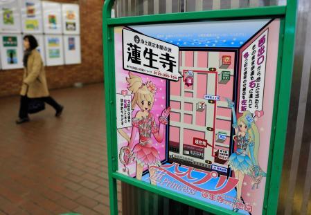 神戸市営地下鉄・新長田駅の改札の近く。看板の中で美少女ヒロインが蓮生寺(神戸市長田区水笠通4)への道案内をしている。