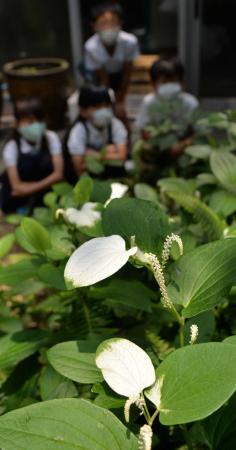 梅雨時に緑色の葉が白く染まる「ハンゲショウ」が、兵庫県加古川市尾上町養田、若宮小学校の中庭で色づき、児童が興味津々な様子で見守っている。