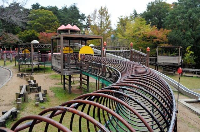 長さ253メートルの滑り台「妙見スカイローラー」やターザンロープ、リングトンネル、丸太渡りをつなげた「回廊式コンビネーション遊具」は子どもたちに人気。幼児広場には木馬やタイヤブランコが設置されている。