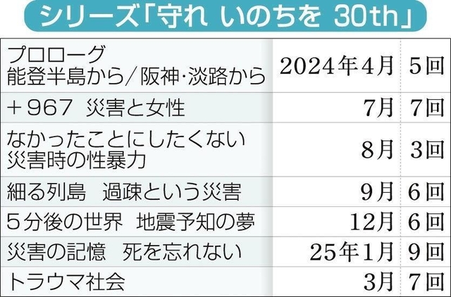 「プロローグ」は、耐震化や関連死といった阪神・淡路の教訓が今に生きているか、能登半島地震の被災地から問うた。「細る列島」では人口減と高齢化で弱る地域の防災力を、「5分後の世界」では地震科学の現在地を、「トラウマ社会」では心の問題をそれぞれテーマとした。
