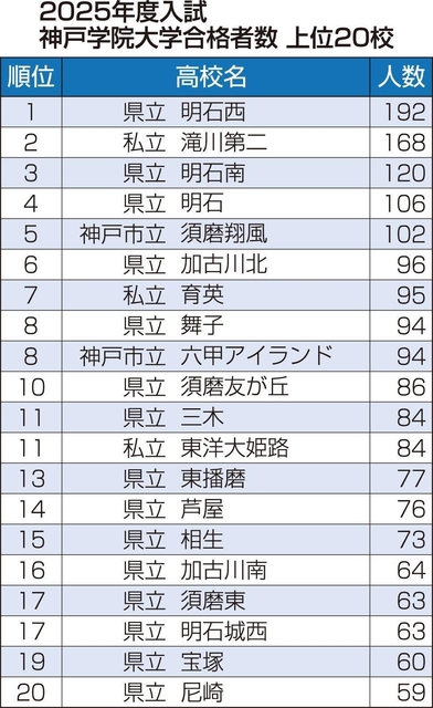 京産大は西脇、近大は県立西宮、龍谷は仁川学院がトップ。神戸学院大は昨年に続いて明石西が最も多く、流通科学大は神戸星城、兵庫医大は滝川第二がそれぞれ最多だった。