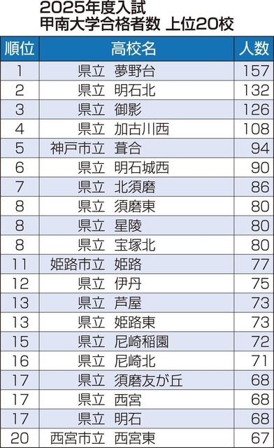 甲南大の合格者上位には県立高のほか、神戸、姫路、西宮、伊丹、尼崎の各市立高も並び、トップ3は夢野台(157人)、明石北(132人)、御影(126人)の順。50人以上の合格者を出した35校のうち、34校が公立勢だった。