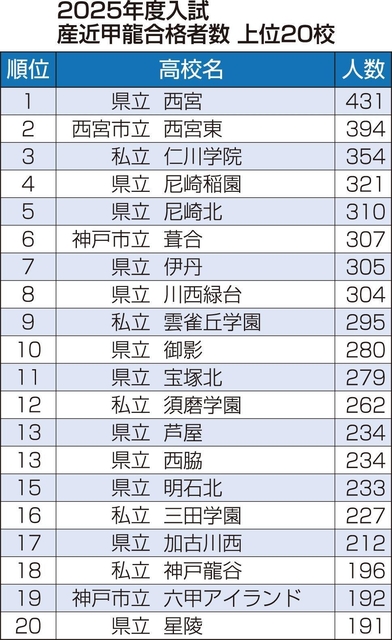 産近甲龍の合計では、県立西宮が431人で最も多く、次いで西宮市立西宮東(394人)、私立仁川学院(354人)と西宮市内の高校がトップ3を占めた。4位、5位にはそれぞれ尼崎稲園、尼崎北と尼崎市内の県立高校が入った。4大学のトータルで200人以上の合格者を出した上位17校のうち、公立は13校、私立は4校だった。