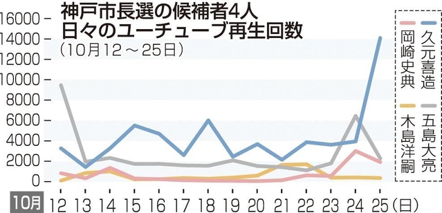 神戸市長選の立候補者は4人、参院選は13人で、選挙期間は14日間と17日間といった違いがあり単純比較はできないが、市長選の告示後1週間を参院選の同期間と比べると、Xに投稿された候補者名の表示回数の合計は参院選の約0・8%、ユーチューブの再生回数の合計は約1・5%にとどまった。
